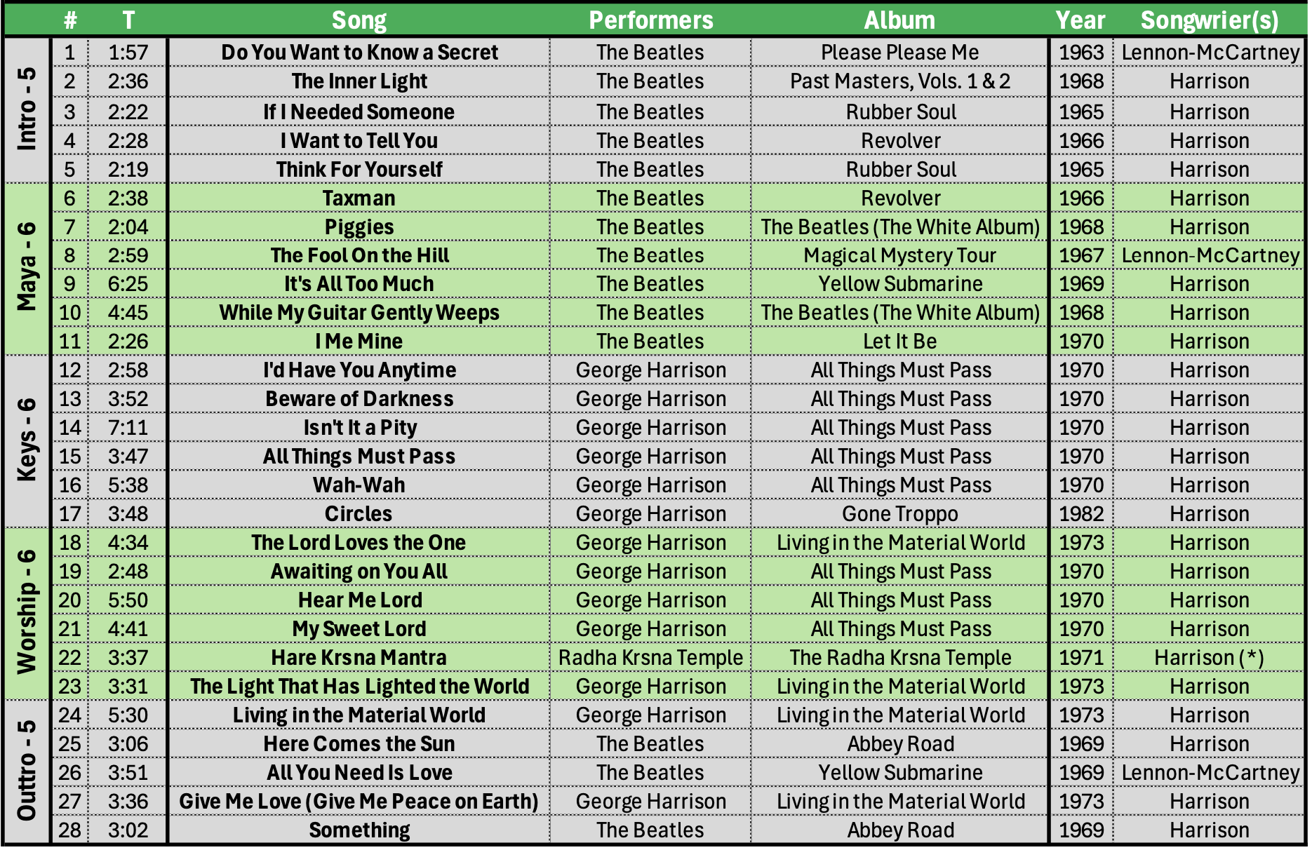 As part of my Great Work, I’ve developed a worldview where I’ve reconciled my spirituality and the physical, or material, world. There is a lot more that goes along with this work than just listening to music, and these playlists provide daily and regular reminders to worship, remember we are the light that has lighted the world, all things must pass, and all you need is love. The idea here is to, ala A Clockwork Orange or 50 First Dates, use this playlist of (mostly) George Harrison Music to help rewire your brain and make you a better person. You can do this with headphones while meditating, while driving to work via the car’s audio, or while cooking dinner – the point is to not let perfection be the enemy of progress, and to commit to finding time to play the full playlist every day. Think about listening to this music like taking medicine, because it literally is medicine for your soul. There is more to this work – time management, reading, study of the physical world, meditation, ordering of your universe, dissolution of your precious ego, high magick, the Four Noble Truths, and more. Eventually you learn how to “hear the music”, read the world as poetry vs prose, and engage with history and religion allegorically and symbolically. All language is, fundamentally, symbols within our brains and music is a language of non-visual symbols. By listening to this playlist and practicing a good and virtuous life, we can perform alchemy – the transmutation of our polluted souls to pristine gold. |